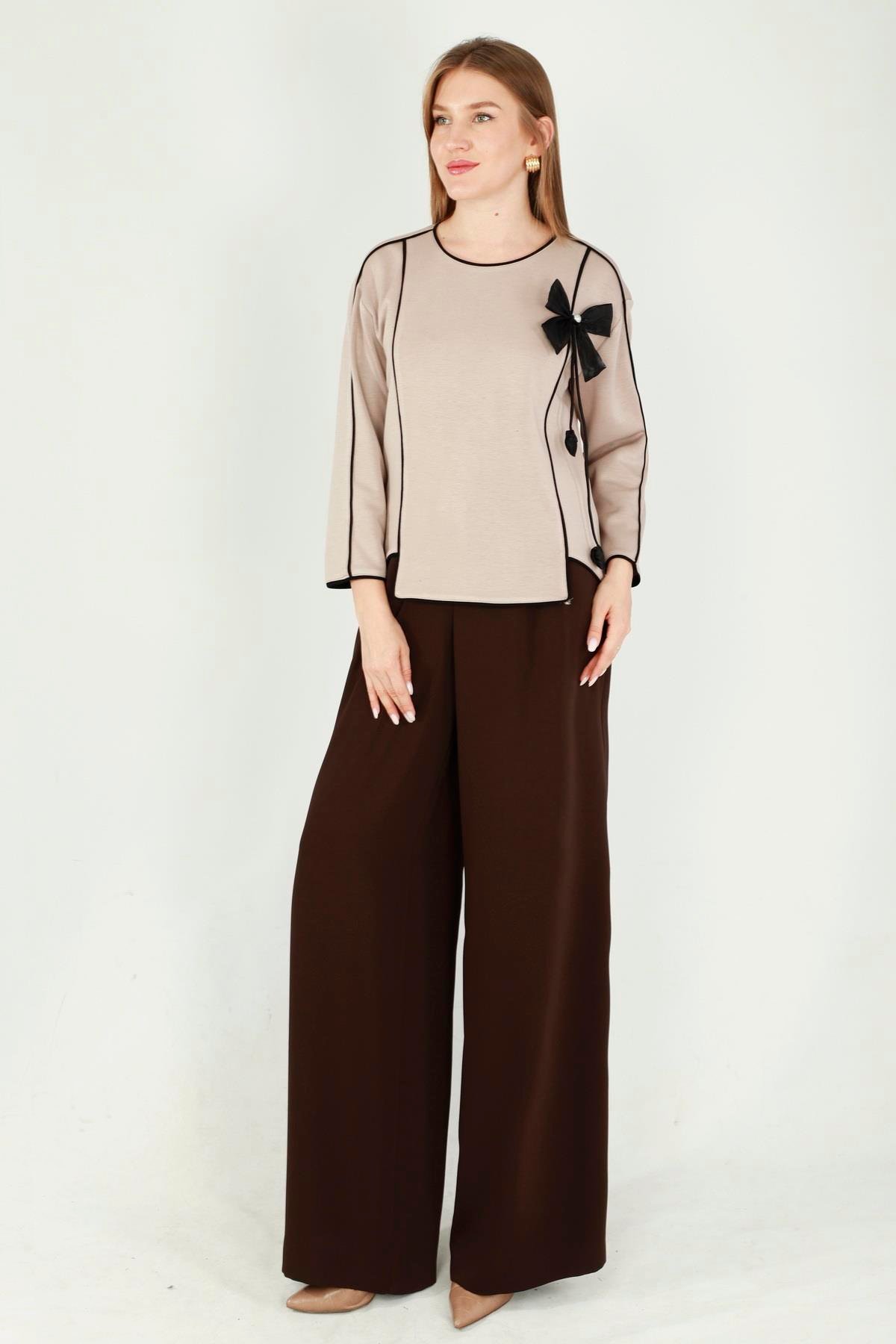 Zarif çiçek aksesuarlı bej bluz, feminen ve modern bir şıklık sunar.
