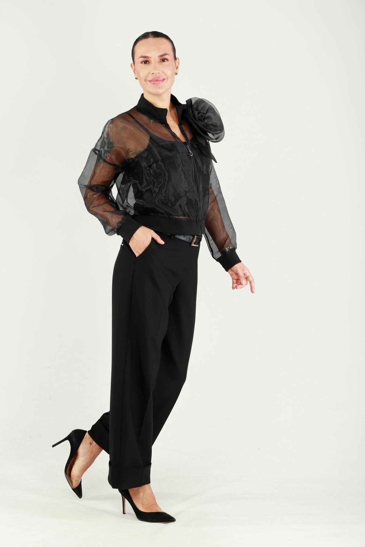 Modern tasarımıyla öne çıkan siyah organze bomber ceket, çiçek aksesuar detayı ve ikili görünümüyle şıklık ve tarzı bir arada sunar.