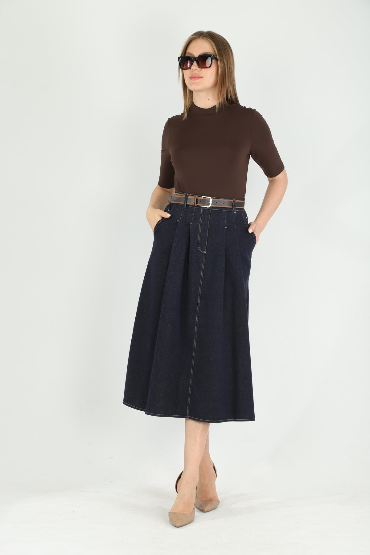 82 cm boyundaki günlük kot etek, arkası lastikli bel yapısı ve kemer detayıyla konfor ve şıklığı bir arada sunar.