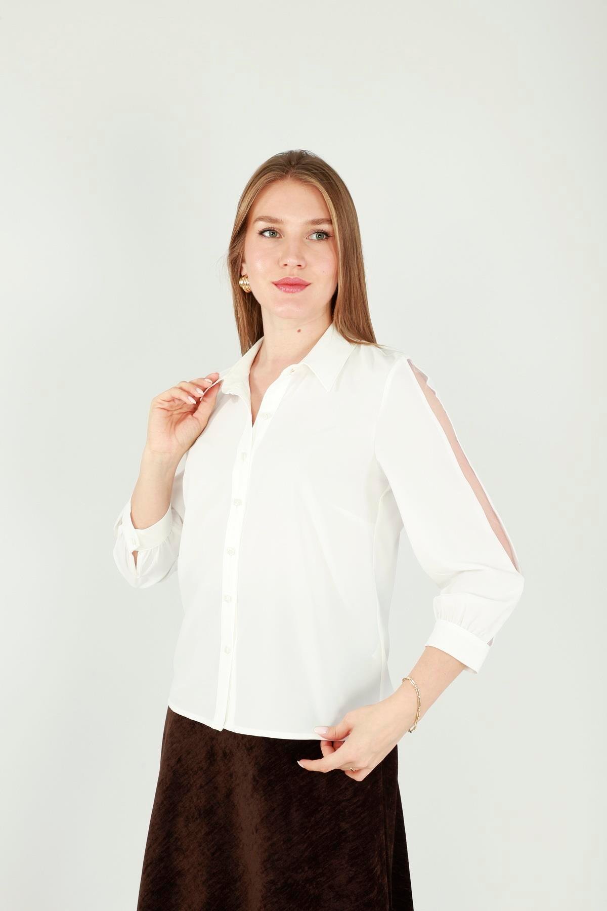 Şıklığı klasik çizgilerle buluşturan beyaz gömlek, kolundaki file detayıyla modern bir dokunuş kazanıyor.