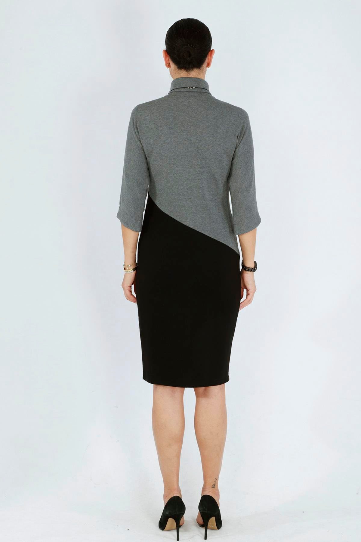 Şıklığı ve rahatlığı bir araya getiren gri triko elbise, deri cep detayı ve şık kolyesiyle modern bir stil sunar.
