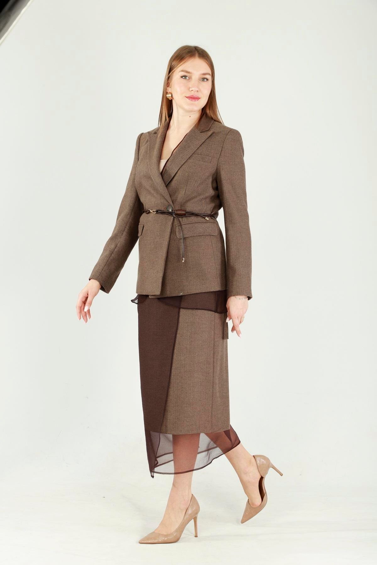 Zarif organze detaylarıyla öne çıkan kahverengi etek ceket takım, şık ve sofistike kombinler için ideal bir seçim.