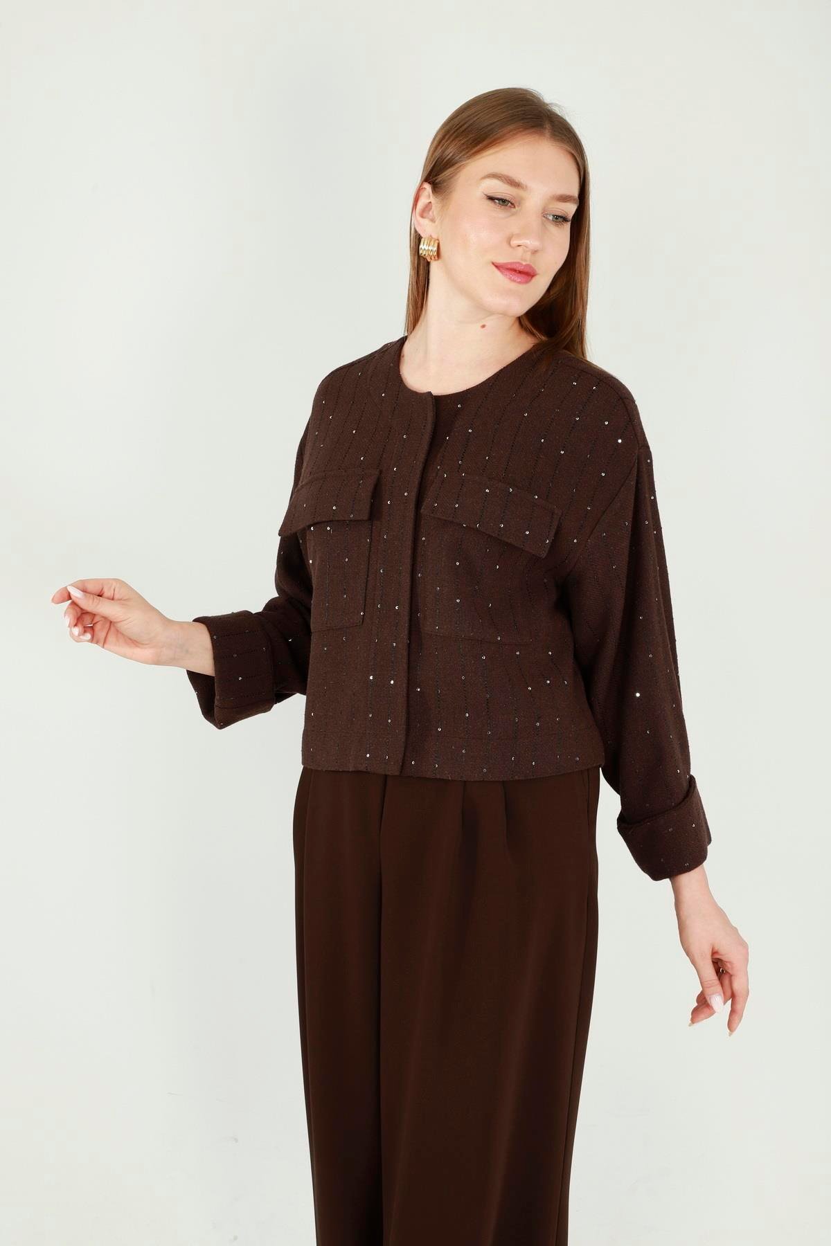 Şık payet detaylarıyla dikkat çeken kahverengi ceket, modern ve zarif kombinler için ideal bir seçim.