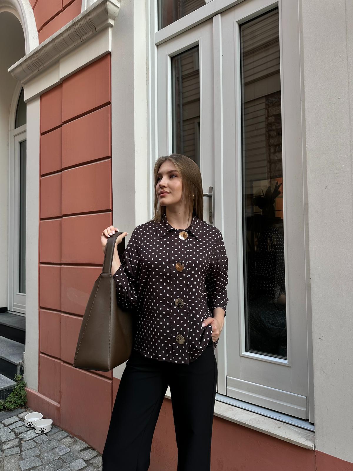 Zarif puantiye deseniyle öne çıkan kahverengi bluz, rahat kesimi sayesinde hem şık hem de konforlu kombinler için ideal.