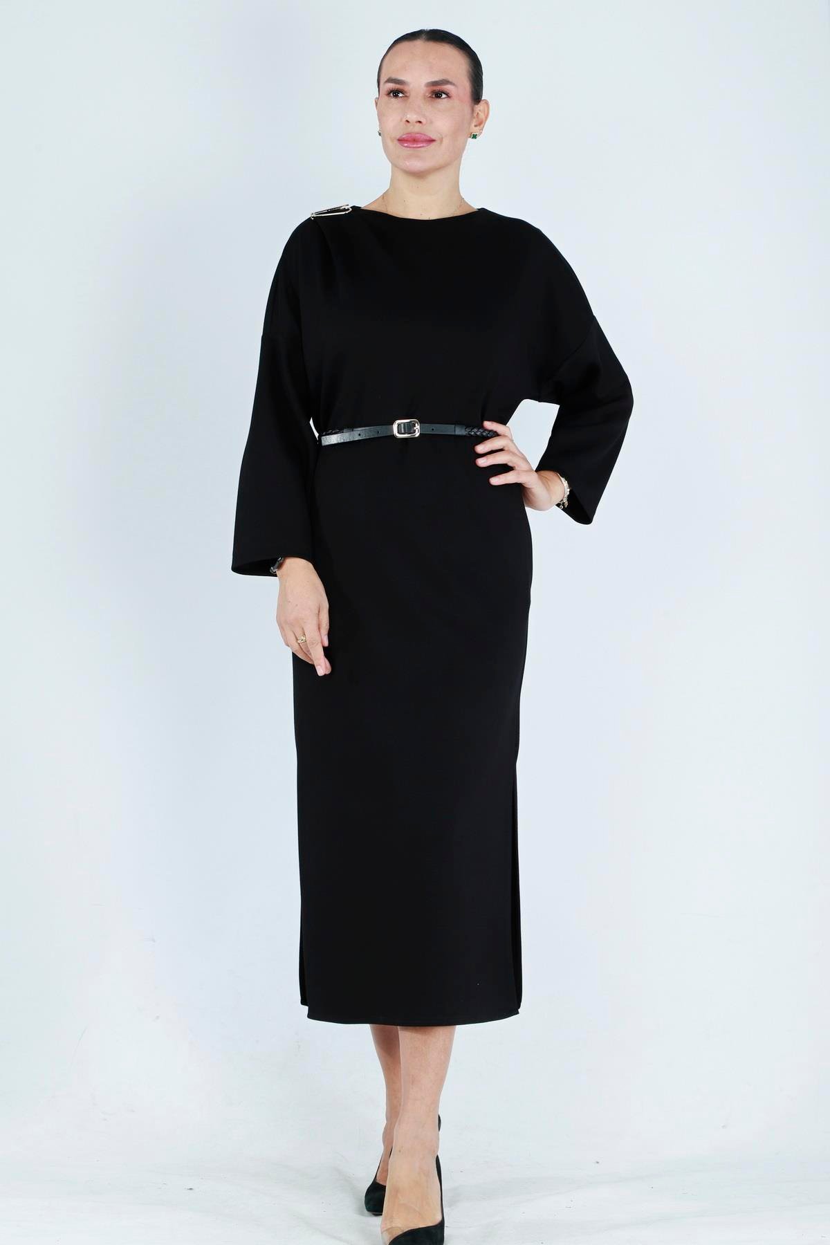 Şıklığıyla öne çıkan siyah elbise, kemer ve toka detayıyla modern bir görünüm kazanıyor.